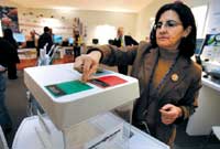 سيدة تقوم بعرض طريقة عمل صندوق الاقتراع النزيه الذي تم إنتاجه بتوجيه من الحكومة الإسبانية وتعاون قطاع الشركات الخاصة والجامعات التقنية في إسبانيا ........