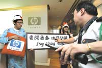 يبدو أن شركة هيوليت باكارد المشهورة باسم إتش بي HP تواجه الصعوبات مجدداً مع جمعية السلام الأخضر في عاصمة التجارة الصينية هونج كونج. ويظهر في الصورة مجموعة من المعارضين ........