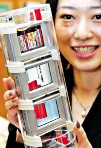 الطالبة كاوري أوتشياي اليابانية من جامعة كيو اليابانية تستعرض النموذج الأولي من اختراعها التقني المختص بتصفح الكتب آلياً، وهذا الجهاز مزود بثلاث شاشات من نوع LCD إحداها ........