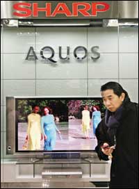 أحد المواطنين اليابانيين يمر بالقرب من تلفزيون قامت شركة شارب بصنعه وهذا المنتج المزود بشاشة مسطحة من نوع (LCD) تعرض الصورة بنقاوة متناهية حسب قول الشركة.