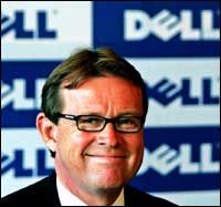كيفين رولينز المدير التنفيذي ورئيس مجلس إدارة شركة ديل الأمريكية يبتسم للصحفيين في مؤتمر صحفي في العاصمة الهندية نيودلهي.
