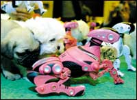 مجموعة من الكلاب الآلية تلعب بشكل طبيعي مع الكلاب الأخرى خلال حفل تدشين مشروع الكلاب الآلية في كوريا الجنوبية.