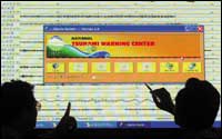 عدد من الموظفين يراقبون شاشة قياس الاهتزازات الأرضية في مركز الزلازل الوطني بجاكرتا خوفاً من تكرار مأساة تسونامي.