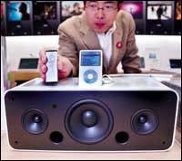 ماسايوتشي سوزوكي يعرض في إحدى صالات العرض بالعاصمة اليابانية نظام الهاي فاي الجديد(Hi-Fi) لجهاز الآي بود (iPod) والذي زوّد بسماعات مكبرة صوتية ذات جودة عالية ونقاوة متناهية ........