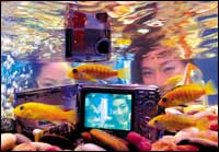 عدد من العارضات التابعات لشركة أولمبوس اليابانية ينظرن من خلال زجاج حوض سمكي لكاميرا من إنتاج الشركة اليابانية.