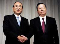 صورة تجمع كلا من ايساو يوشيدا (يسار) رئيس شركة يوكوغاوا الإلكترونية وهو يصافح تشياكي ايتو المدير التنفيذي بشركة فوجيتسو العملاقة في صناعة الإلكترونيات.