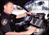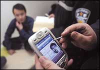 جهاز كمبيوتري كفي بيد أحد أفراد عناصر شرطة العاصمة الصينية بكين خلال تفقده لعدد من العمال اللاجئين في أحد الملاجئ الحكومية. وكما هو واضح في الصورة فإن عناصر الشرطة الصينية ........