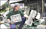 أحد نشطاء منظمة السلام الأخضر يقوم بتفحص خردوات من القطع الإلكترونية بالمقر الرئيسي الأوروبي لشركة هيوليت باكارد(HP) بمدينة جنيف العاصمة السويسرية.