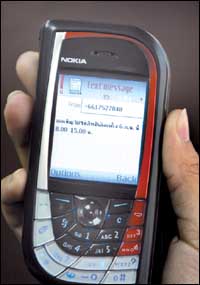 فتاة تايلندية تستعرض رسالة على جوالها مرسلة من شركة الجوال تذكر بموعد الانتخابات القادمة في تايلاند ويبلغ عدد الأفراد الذين يستخدمون الهواتف النقالة في تايلاند قرابة الـ ........