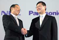 صورة تجمع بين كأورو يانو (يسار) رئيس مجلس إدارة شركة NEC ، وفوميو اوهاتسوبو رئيس مجلس إدارة شركة ماتسوشيتا الرائدة في مجال الصناعات الإلكترونية وذلك خلال المؤتمر الثنائي ........