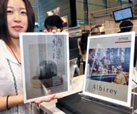 تشيزورو ناميكي موظفة بشركة هيتاشي اليابانية والرائدة في صناعة الإلكترونيات تستعرض منتج الشركة الجديد من الشاشات الورقية والتي لا يتعدى حجمها حجم ورقة ........