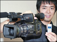 موظف بشركة سوني اليابانية يعرض جهاز تصوير فيديو جديد مزود بثلاثة مجسات تصوير لتسجيل أفلام بسعة 1920X1080 بكسل على بطاقة ذاكرة جديدة تعطي صورا عالية الدقة. وسوف يكون الجهاز متاحا في الأسواق في نوفمبر القادم.