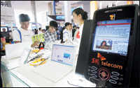 زوار يتفحصون بعض معدات تقنية الاتصالات المعروضة ضمن فعاليات قمة فيتنام للاتصالات بمدينة هانوي والمعرض المصاحب. وتعد فيتنام ضمن أسرع أسواق تقنية الاتصالات نموا على مستوى آسيا.