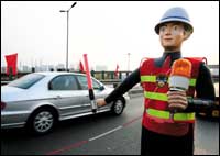 رجلاً آلياً بحجم الإنسان الفعلي يقوم بتنظيم حركة السير بالقرب من منطقة إصلاح في العاصمة الصينية بكين. ويبدو أن حركة السير الخانقة التي تهلك رجال المرور الصينيين قد حلت من ........