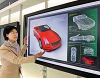 مايوكي ناكاياما موظفة بشركة شارب الإلكترونية تستعرض منتج الشركة الجديد من شاشات العرض الكمبيوترية والمخصصة للغرض الدعائي وذلك في صالة العرض الخاصة بالشركة في العاصمة ........