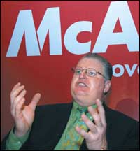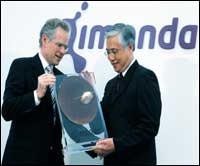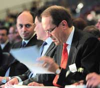 وولف غانج زيبارت (يسار) رئيس مجلس إدارة شركة Infineon الألمانية والمتخصصة في صناعة الشرائح الإلكترونية وإلى جانبه كين واه لوو رئيس مجلس إدارة شركة Qimonda أثناء حضورهما ........
