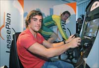 بطل سباق رينولت العالمي للفورمولا وان فيرناندو الونسو وخلف الصورة يظهر بطل سباق الدراجات الأسترالي ريان بيلي يتسابقون على أجهزة المحاكاة لشركة سوني والمخصصة لألعاب ........