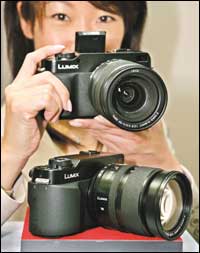 ساتوكو كوبو موظفة بشركة ماتسوشيتا عملاقة الصناعات الإلكترونية تستعرض منتج الشركة الجديد من الكاميرات الرقمية أحادية العدسة في معرض أجهزة التصوير الرقمي المقام في العاصمة ........