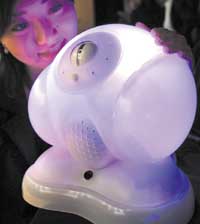 موظفة تابعة لشركة تمسوك (Tmsuk) اليابانية والمتخصصة في إنتاج أجهزة الروبورت تستعرض منتج الشركة الجديد من الروبورتات وقد أطلق عليه اسم روبوريور. ويأتي هذا المنتج بثلاث ألوان ........