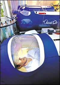 يظهر أحد المواطنين اليابانيين داخل إحدى الكبسولات التي زُودت بـ30% من غاز الأوكسجين المضغوط، وهذا الرجل هو واحد من مئات الرجال اليابانيين الذين يبحثون عن وسائل تخفف عنهم ........