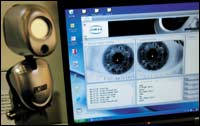 صورة تجمع بين جهاز كمبيوتر محمول وكاميرا محمولة لبصمة شبكية العين خلال عرضهما في المعرض العالمي الأمني والمقام بالعاصمة البريطانية لندن. وهذا الجهاز يتمكن من مسح ........