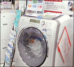 مجموعة من الغسالات الكهربائية معروضة في إحدى الصالات التابعة لشركة توشيبا العملاقة في صناعة الإلكترونيات والرائدة في مجال صناعة شاشات الكريستال السائلة. وكانت شركة توشيبا قد أعلنت مؤخراً عن وجود أرباح في الأشهر التسعة الأولى من العام الماضي مقارنة بنفس الفترة من العام