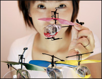 إعداد: أحمد عبد اللطيفطوكيو، اليابان: موظفة بشركة تومي لصناعة الألعاب تعرض أصغر ألعاب الهليكوبتر في العالم، وهي لعبة يمكنها البقاء في حالة طيران لفترة خمس دقائق باستخدام بطارية ليثيوم مع التحكم فيها أثناء ذلك لاسلكيا.