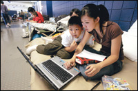 سان دييجو، كاليفورنيا: أطفال ناجون من حرائق كاليفورنيا لم تمنعهم ظروف إجلائهم من منازلهم إلى إستاد كوالكم بسان دييجو من مواصلة اهتماماتهم على الحاسوب، وقد التهمت الحرائق التي بدأ اندلاعها في رومانا بكاليفورنيا مساحات شاسعة من الغابات، ودمرت العديد من المنشآت.