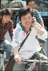 شنغهاي، الصين: صيني يتحدث عبر الجوال أثناء تنقله على الدراجة في شنغهاي. وتأمل شركة (تشاينا موبايل)، وهي أكبر مشغلة للهاتف الجوال في الصين، تدشين خدمات الجيل الثالث قبل نهاية العام، لكن نسبة للتأخيرات المتكررة ساد الظن بأن صناعتها قد لا ترقى إلى مستوى الصناعات المستوردة. وتجد الحكومة نفسها مضطرة إلى توفير خدمات الجيل الثالث في أسرع وقت ممكن قبل حلول