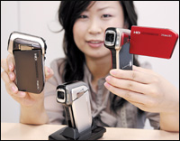 Tokyo, Japan: An employee from Japan's electronics giant Sanyo displays the world's smallest and lightest 720p high- definition digital camcorder "Xacti DMX-HD700", equipped with a 7.1 mega-pixel CCD and a 6.3 - 31.7mm/F3.5 - 4.7 zoom lens to store 3- hour high high-definition movie on a card sized SD memory card.