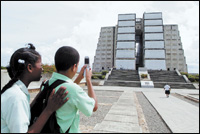Santo Domingo, Dominican Republic: Two schoolchildren take a snapshot with a mobile of the Columbus Memorial Lighthouse in Santo Domingo, during the activities held in commemoration of the 515th anniversary of the discovery of America by Christopher Columbus.