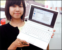 Taipei, - TAIWAN : A woman staff of Asustek Computer Inc, a leading Taiwan computer maker displays a low-cost laptop computer after the company launches the model "Eee PC" in Taipei. The model, mainly targeting children, elderly people, and low-income users in the developing world is powered by an Intel central processing unit and installed with a