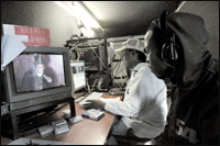 Johannesburg, South Africa: A Soweto TV technician and a producer work in a mobile studio in the Soweto TV backyard in the Johannesburg township of Soweto. Broadcasting in 11 of the Rainbow Nation's different languages, the channel currently airs for five hours a night to a potential audience of around two million who live both in Soweto and outlying