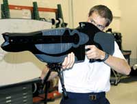 النقيب درو غوتلير التابع للقوات الجوية الأمريكية يستعرض سلاح الليزر الجديدPHaSR الذي يعمل على تقنية غير مميتة طورت من قبل مختبر الأبحاث والطاقة ........