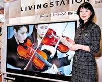 موظفة تابعة لشركة سيكو أبسون Seiko Epson العالمية المتخصصة في مجال الصناعات التكنولوجية والبصرية، حيث تستعرض جهاز التلفاز الجديد من الشركة الذي يحتوي على ثلاثة أقراص صلبة ........