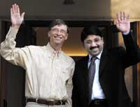 المدير التنفيذي ورئيس مجلس إدارة شركة مايكروسوفت العالمية السيد بيل جيتس (يسار) ووزير الاتصالات الهندي السيد ديان دهي ماران يلوحان للمصورين قبيل اجتماعهما في العاصمة ........
