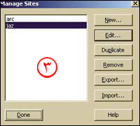 نقوم مرة أخرى ونفتح قائمة site ومنها manage site تظهر الشاشة التالية وبها جميع المشاريع القائمة نختار المشروع الذي نعمل عليه ثم نختار زر.