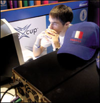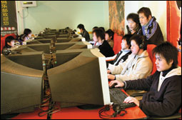 فتاة صينية تتصفح الإنترنت بالقرب من جهاز حاسوب يعرض لعبة ابتكرتها حكومة ولاية شيجيانغ بشرق الصين اسمها (المحارب الذي لا يرتشي) على الإنترنت، بينما تشير نافذة إلى أن الموقع الذي يعرض اللعبة قد تجاوز الحد الذي يسمح به خادم الموقع (server) لكثرة عدد المستخدمين. فقد لاقت اللعبة
