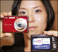 موظفة بشركة كاسيو للالكترونيات تعرض كاميرا جديدة من نوع إكسيليم خلال مؤتمر صحفي في العاصمة اليابانية طوكيو والكاميرا مزودة ببرنامج خاص لتحميل صور الفيديو إلى موقع (يوتيوب) الالكتروني.