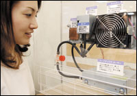 موظفة بشركة هيتاشي اليابانية للالكترونيات تنظر إلى نظام التبريد السائل الجديد المستخدم للحاسبات المكتبة خلال عرض صحفي جرى في العاصمة اليابانية طوكيو وتعمل هذه التقنية التي طورتها شركتا هيتاشي وإن إي سي على تخفيض نسبة الضوضاء عند تشغيل الحاسوب بمقدار 22 ديسيبل.