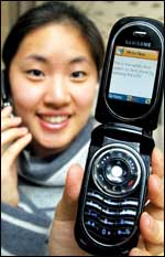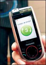 موظفة في شركة سامسونج الكورية تستعرض المنتج الجديد للشركة من الهواتف النقالة والذي أطلق عليه اسم SGHP207 وذلك في المقر الرئيسي للشركة في سيئول.