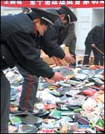 عدد من المراقبين لسوق الاسطوانات الممغنطة يجمعون بعض الاسطوانات المضبوطة قبل إحراقها. ويذكر أن أكثر من 300.000 اسطوانة ممغنطة قد تم تدميرها خلال هذه الحملة التي تشنها ........