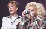 كارلي فيورينا، المديرة التنفيذية لشركة HP تقدم المغنية جوين ستيفاني (إلى اليمين) بينما تحمل المغنية الكاميرا الرقمية الجديدة من إنتاج HP.