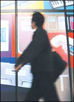 رجل أعمال يسير بجوار لوحة إلكترونية للإعلانات خارج معرض لاس فيجاس للإلكترونيات..