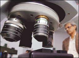 عالم هندي ينظر إلى ميكروسكوب ضوئي عملاق بأحد معامل نانو تكنولوجي بمركز جواهر لال نهرو للأبحاث في مدينة بانجالور بالهند. وقد أظهرت أبحاث النانو تكنولوجي نتائج واعدة في علاج أمراض النخاع الشوكي والشلل.