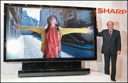 رئيس شركة شارب اليابانية للإلكترونيات يعرض أكبر شاشة كريستال في العالم (108 بوصة) خلال مؤتمر صحفي في العاصمة اليابانية. وقد أعلنت شركة شارب للعام الرابع على التوالي تحقيق أرباح قياسية بفضل مبيعات أجهزة التلفزيون ذات الشاشات المسطحة.