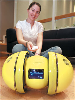 موظفة بشركة zmp اليابانية للروبوتات تعرض روبوتاً آلياً مخصصاً لتشغيل موسيقى أي بود الرقمية الذي تنتجه ابل. وتم تزويد الروبوت بأربع سماعات ستيريو مدمجة وبإمكان الروبوت الذي تم تصميمه على شكل بيضة التحرك بشكل أتوماتيكي أو بواسطة ريموت كنترول. وتم طرح الروبوت للبيع بسعر 900