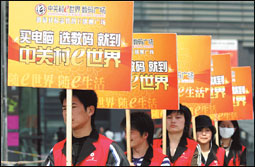 عمال صينيون يحملون لافتات للترويج لسوق متخصص في بيع المعدات الالكترونية والرقمية في العاصمة بكين . |