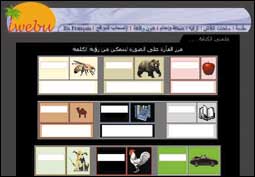 المحاور الرئيسية: مجموعة من الصور التي تمرر عليها الفارة لتظهر الكلمة التي تعنيها مثل تفاحة وهناك مستطيل للكتابة.