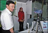 رئيس الوزراء التايلاندي السيد تاكسين شيناواترا (يسار) يتابع عملية إصدار بطاقة هوية ذكية لمواطنة تايلاندية في إقليم بتاني الذي يبعد قرابة 1055 كلم جنوب العاصمة التايلاندية بانكوك. وسوف تصدر هذه البطاقة الذكية لمن أعمارهم ما بين الـ17 والـ40 عاماً والقاطنين بالمناطق الجنوبية من البلاد التي من الممكن أن تحل أزمة الجنسية ومتابعة الميليشيات غير الرسمية التي تحوم حولهم الشكوك بأنهم يستخدمون جنوب تايلاند كجسر عبور للأراضي الماليزية.
